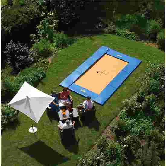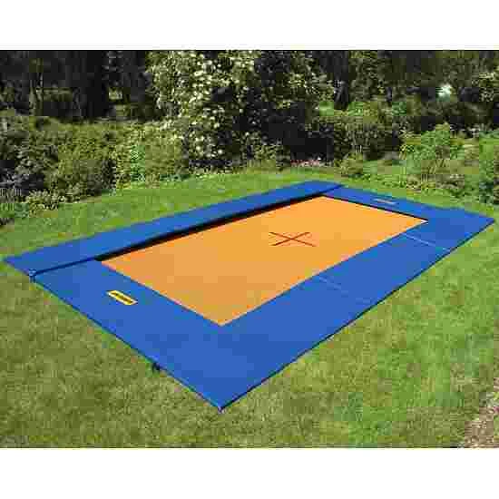 Level with the ground and weatherproof. Required pit depth: 1.15 m. Complies with standard for sports equipment (DIN 13219). Hot-dip galvanised frame and springs. Incl. strap and spring clip. Safety frame padding made of PE foam with hard-wearing PVC cover. Max. load: 800 kg.